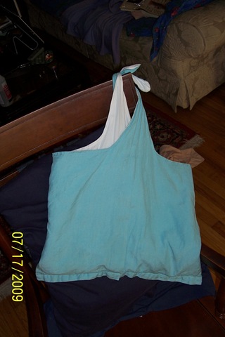A nutrition client of mine lost 85 pounds, she was kind enough to give me some old, beautiful linen dresses, they made awesome shopping bags. I incorporated some of the pleats and embroidery that was part of the clothing;