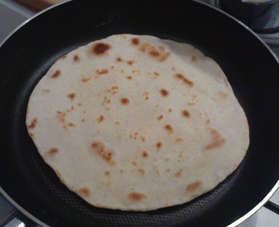2) use 2 ziploc bags that you have sprayed lightly with Pam, (or rub with butter or coconut oil, I don’t use Pam because it’s in a can, and it’s expensive)), place a slightly larger than golf ball size ball of dough between your hands, roll it into a ball. Using a pan that has a flat bottom, gently press tortilla flat. Peel off into your hand and place in hot skillet.