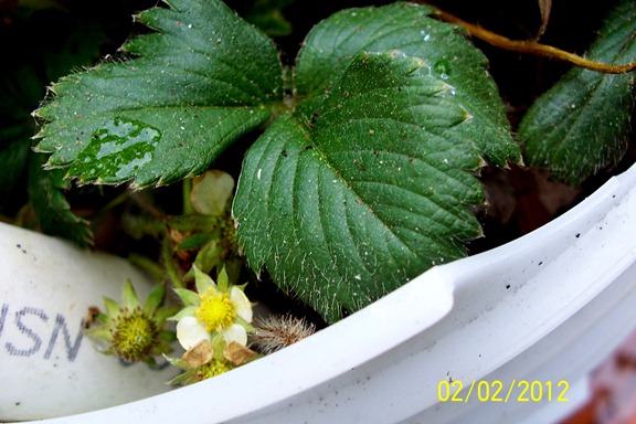 The strawberry has bloomed, this has been outside all winter also. All plants are in sub-irrigated containers.