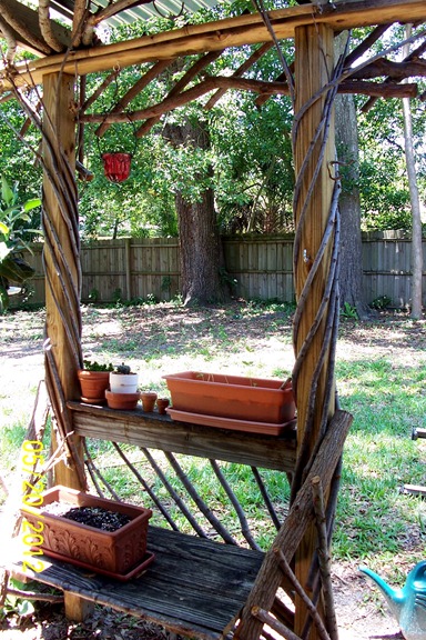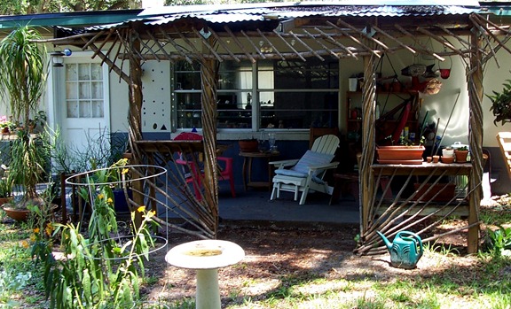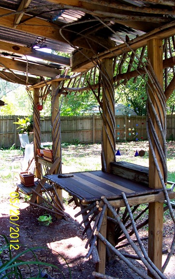 Billy Willow came last weekend and worked his magic and did willow work. The original metal roof had a layer of netting and a layer of worn out bamboo shades (no idea why!) that had stuff nesting in it. He ripped that out, repaired some of it, added a table and bench and many willow embellishments.