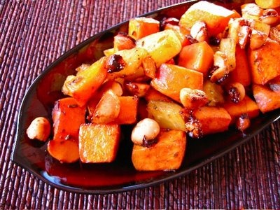2) Sauté shallots in butter until tender, add pineapple, sugar, cranberries add thyme and simmer until thickened and liquid is absorbed. Add balsamic vinegar and remove from heat. Serve over sweet potatoes.