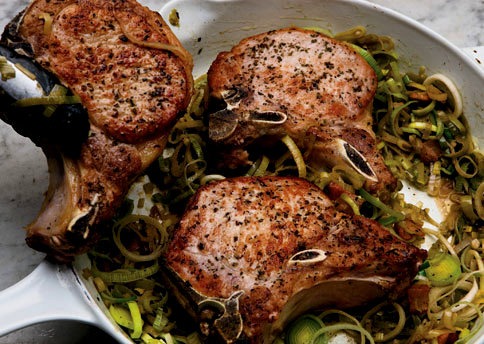 4) Nestle chops in leeks in skillet. Reduce heat to medium-low. Cover; simmer 3 minutes. Turn chops over. Cover; simmer until thermometer inserted into thickest part of chops registers 140°F to 145°F, about 3 minutes longer. Transfer chops to platter. Tent loosely with foil to keep warm.