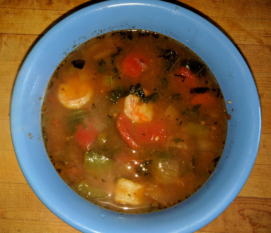 3) Add greens to soup, simmer until greens are bright green, about 3 minutes. add shrimp, simmer 1 more minute. turn off heat, add file powder, season with salt and pepper and Tabasco.