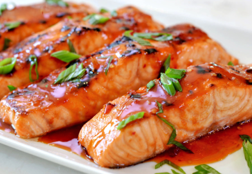 Broil for 6 minutes, rotating baking sheet once. Remove from the oven and brush top of each fillet with 2 tsp of Thai sweet chili sauce. Return to the oven and broil for another 2 minutes or until salmon has caramelized. Serve hot garnished with green onions, extra sauce.