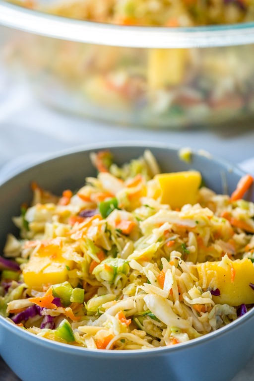 - In a large bowl, toss together cabbage, mango, jalapeño, carrot, garlic and then drizzle mustard dressing on top.