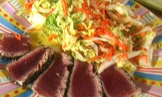 Heat the olive oil in a 12-inch non-stick pan over medium high heat. Add fish to pan and cook until rare, about 2 minutes per side. Alternatively, cook until done to your likeness. Slice thin and distribute among 4 serving plates. Serve with a generous portion of Napa cabbage slaw.