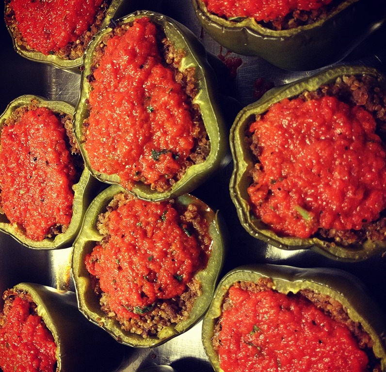 5) Spoon the stuffing compactly into the peppers and arrange in the baking dish. cover the pan tightly with its lid or foil and bake for 1 hour.