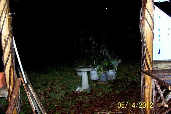 Billy’s willow work, my air chair, poppies and other flowers just sprouting, wind chimes I made from bamboo growing in yard.