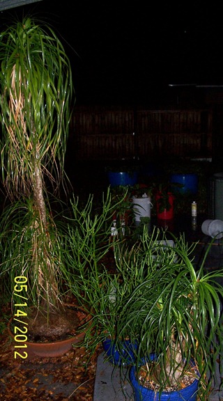 Posted: May 15, 2012 Filed under: Gardening 7 CommentsBack porch; pony tail palms, one old bonsai, cactus, in the very back are blue barrels with sweet potatoes, grow buckets with Swiss chard, beet greens, orange tree, Milkweed thistle.