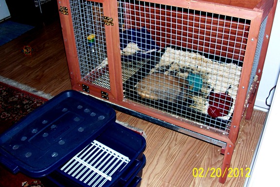 Posted: February 22, 2012 Filed under: Gardening, Non-Toxic Choices Leave a commentMy Holland Lop bunny, Cornelius, is 1 year old. He just went from cage to condo. I found it for cheap on Craigslist! I also built a worm farm this last weekend; 2 Rubbermaid Tote, heavy ones, two small sections of wire shelving held together by 3 zip-ties so that the newspaper will stay damp and allow the liquid to run off into the bottom tub. The top one has holes drilled on the bottom and up near the sides for ventilation. The worms eat the newspaper and just about everything you put in there. Along with some soil, rabbit droppings mixed with sawdust from the rabbit cage and food scraps will be ready for the red worms soon. I’ll have great fertilizer and a ready source of worm farm material.