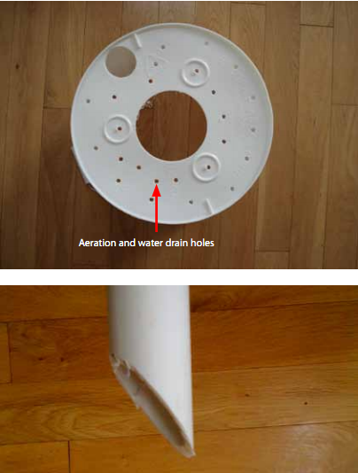 4) Now place the 3 Solo cups upside down in the 5 gallon bucket. Take the panty hose and cut each leg off about 14 inches up. Place one leg in the Solo cup and fill it with the soil mixture. Dampen the soil, set aside. Place the lid to the bucket on the upside down cups, slide the PVC pipe in the hole you’ve drilled for it, diagonal side down. Use zip ties to hold the pipe straight up after drilling two small hone near the top of the bucket. Put the cup with soil in the large hole in the middle.