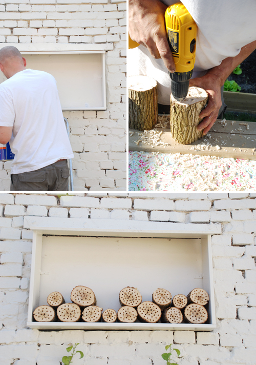 All you need is a wooden box, open on one side, which is then fixed to a sunny fence or wall. You then fill it with blocks of wood or small logs in which you have drilled small holes. A variety of solitary bees will use these tunnels as nest sites. The box does not need to be deeper than 8ins, but must have an overhang at the top to keep rain off. You may already have a wooden box or a drawer from an old wooden chest of drawers that you can adapt for this purpose. If not, you can make one. The one in the picture is 8ins deep, 12 ins high at the front and 12ins wide, made out of untreated European spruce. I have given it a sloping, slightly overhanging roof to deflect rain.