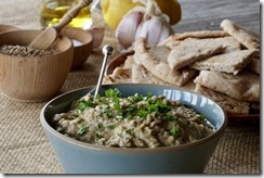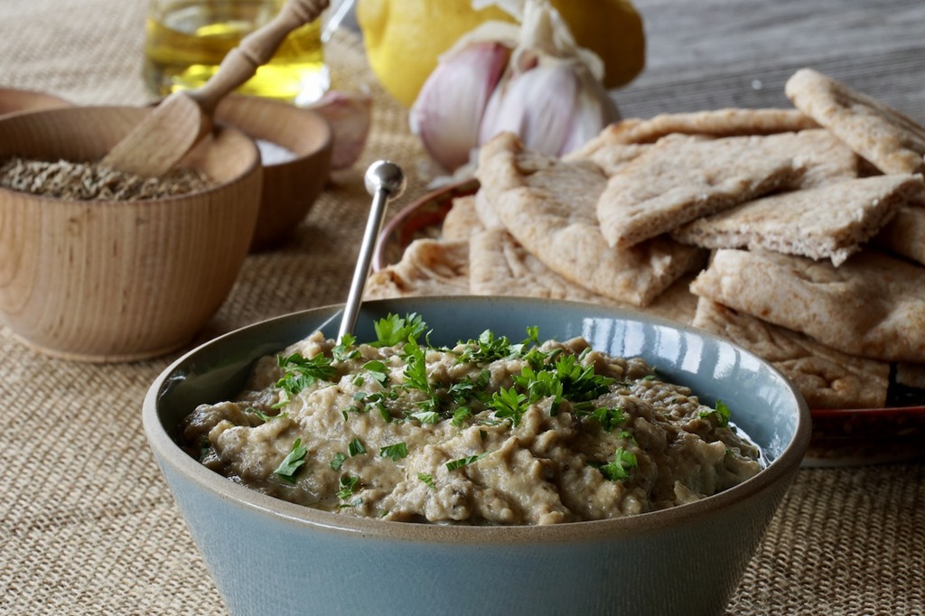 - Transfer eggplant, mashed garlic, tahini and lemon juice into a bowl and stir together. Add cumin and stir again. Add salt and pepper to taste.